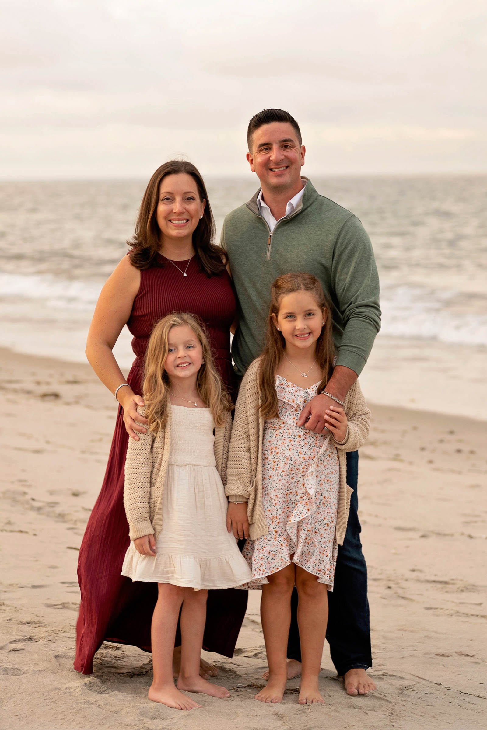 My wife Courtney and I met in 6th grade — same homeroom, Ms. Brock's class. We were friends immediately, stayed close through separate high schools, and finally started dating in the summer of 2009. I proposed on a rooftop overlooking the Back Bay in Boston on December 27, 2013, surrounded by her family. We got married on October 10, 2014. We have two daughters, Aria and Mia.